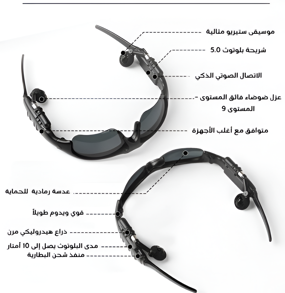 النظارات الشمسية الذكية المزودة بتقنية البلوتوث للصوت - استمع إلى الموسيقى، وأجرِ المكالمات، و إحمي عينيك من الأشعة الضارة، كل ذلك في تصميم أنيق، مريح وخفيف الوزن. صوت مثالي، وراحة طوال اليوم، وحماية تامة للعينين.